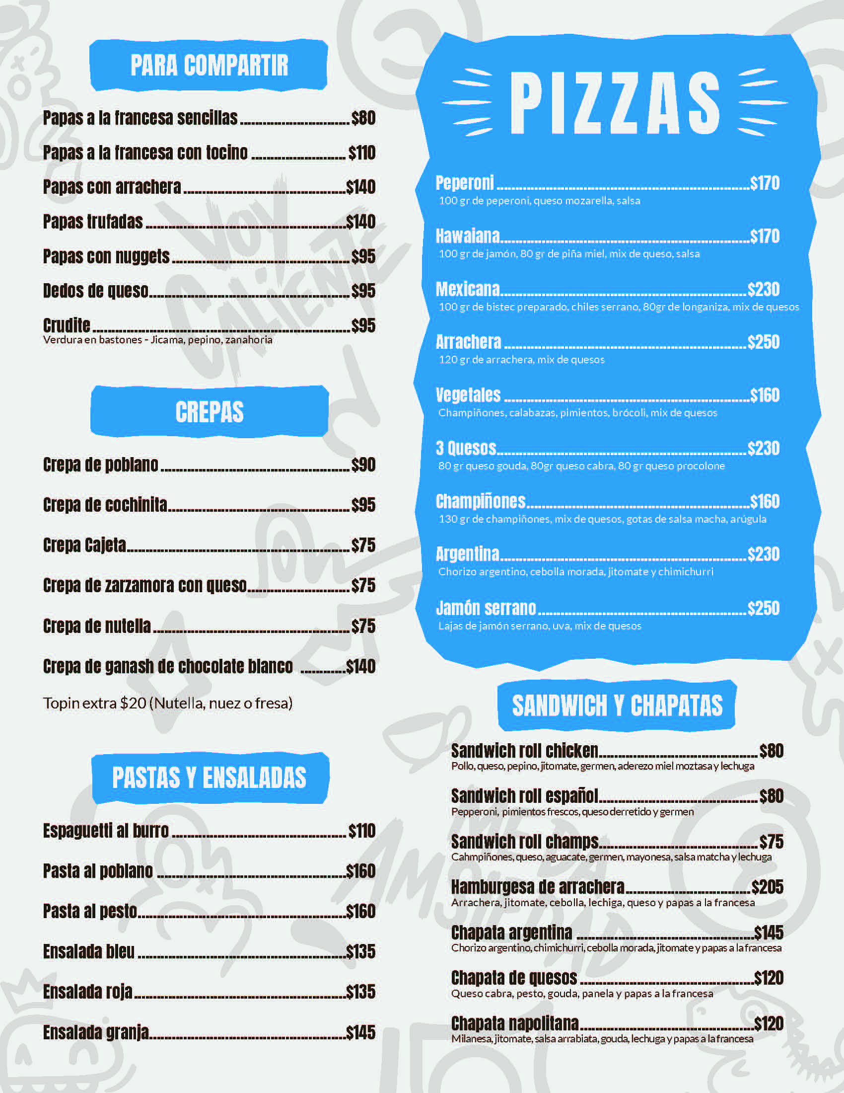 Somos tu destino gastronómico para disfrutar de platillos auténticos y creativos. Desde energéticos desayunos mexicanos e internacionales hasta robustos platos fuertes de arrachera y pechuga asada , y nuestra variada selección de Crêpes dulces y saladas. ¡Sabor, tradición y frescura en cada bocado!